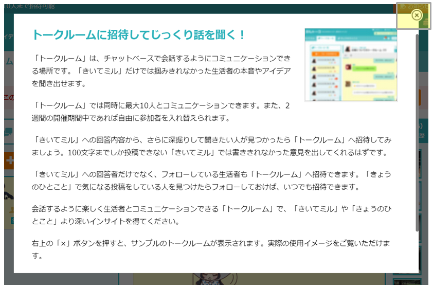 1-2. ポップアップ画面が開き、トークルームの説明が表示されます。説明をご一読いただき、右上の「×」をクリック。