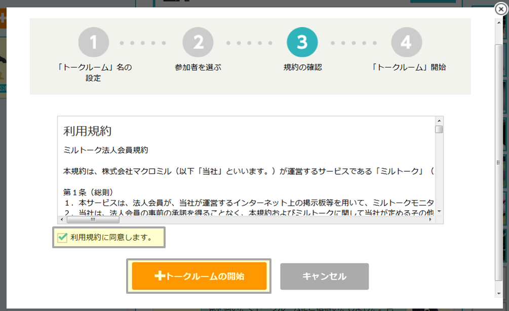 1-6. 利用規約に同意いただいたうえ「利用規約に同意します」にチェック。「+トークルームの開始」をクリック。