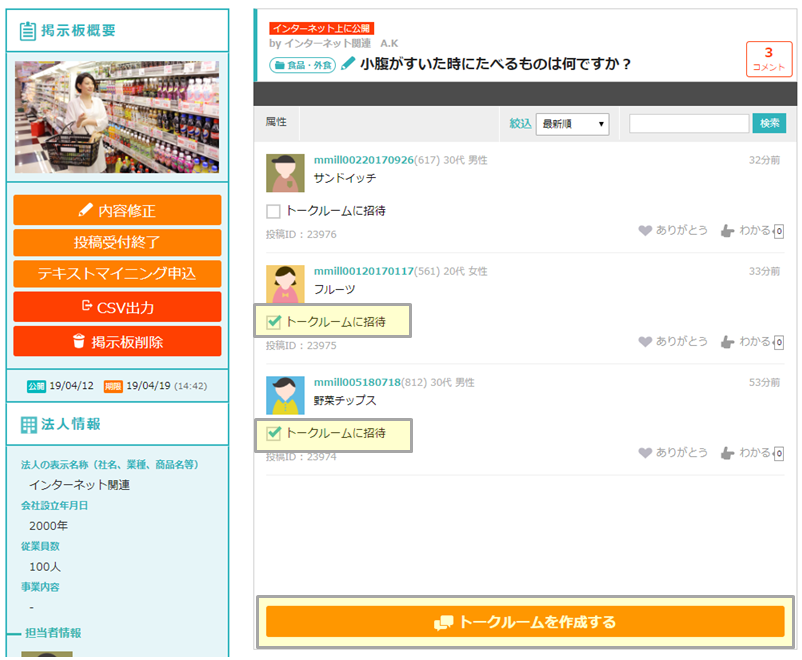 2. 掲示板にコメントしたモニタの中から、モニタを選んでトークルームを作成する