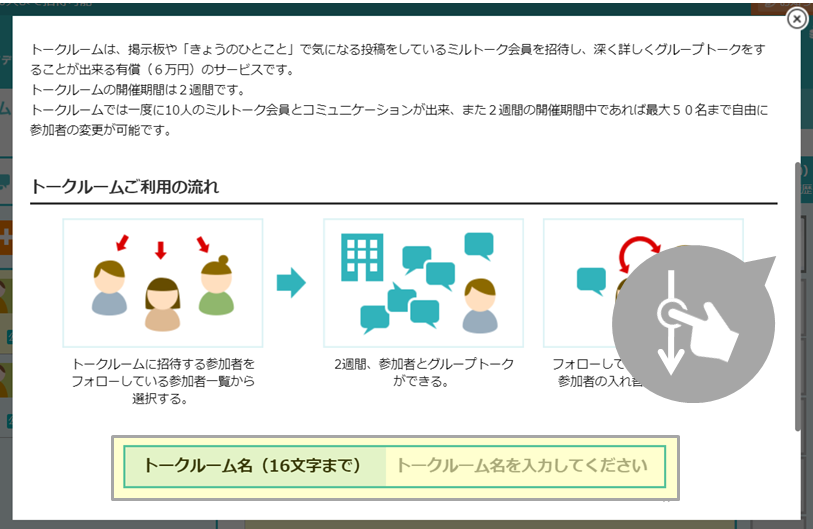 1-4. ポップアップ画面が開きます。トークルーム名を記入し、画面をスクロールします。(トークルーム名はモニタにも表示されます。)