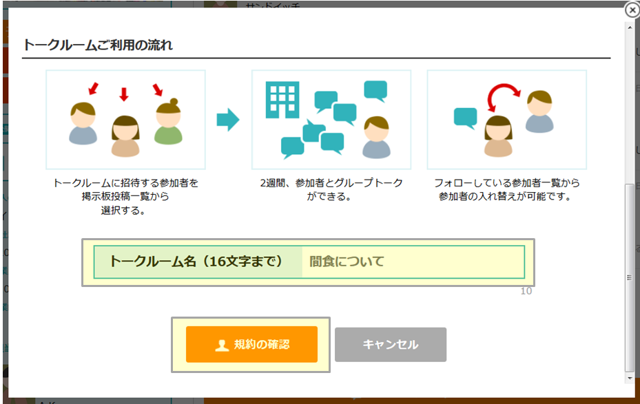 2-2. トークルーム名を記入し「規約の確認」ボタンをクリックします。